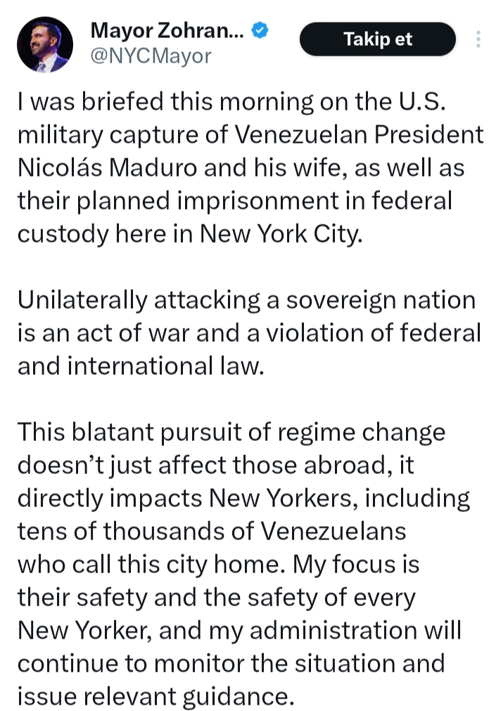 Bu açık rejim değişikliği arayışı yalnızca yurtdışındakileri etkilemekle kalmaz, aynı zamanda New Yorkluları da doğrudan etkiler; buna bu şehirde yaşayan on binlerce Venezuelalı da dahildir. Benim odak noktam onların ve tüm New Yorkluların güvenliğidir. Yönetimim durumu izlemeye ve ilgili yönlendirmeleri yapmaya devam edecektir.”