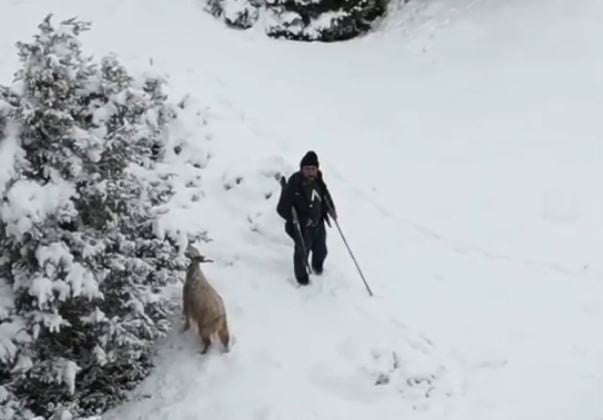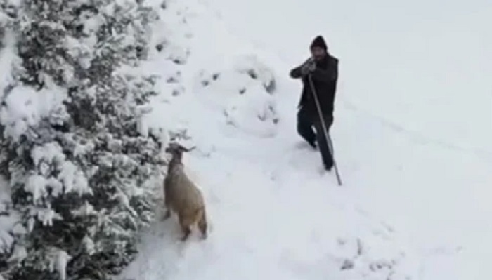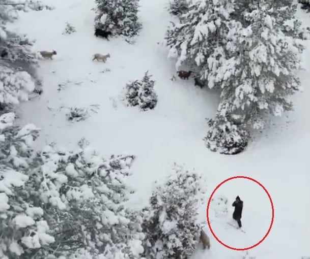Ankara’nın Nallıhan ilçesinde, beyaz örtüyle kaplanan ormanlık arazide hayvanlarını otlatan bir çoban, kendisine yaklaşan drona karşı tüfeğiyle savunma pozisyonuna geçti.