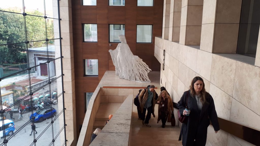 Şimdilerde bir camın arkasında ve zeminden yüksekte İstanbul’un tam ortasındaki Yapı Kredi Sanat Merkezi’nin üçüncü katındaki kuytu köşesinden İstiklal Caddesi’nin dar alanda kısa paslaşmaların olduğu Galatasaray dört yoluna bakıyor. Uygarlıklar denizini simgeleyen heykel artık gökyüzüne bakamıyor. Suçlu olduğu için değil, Ayasofya’nın kapısını yiyip yutanlardan, heykelleri kıranlardan korunması için hapse atıldı Akdeniz. Kollarını birilerini saracak gibi açmış olan heykel; camdan zindanında, İstiklal Caddesi’ni gözlüyor.