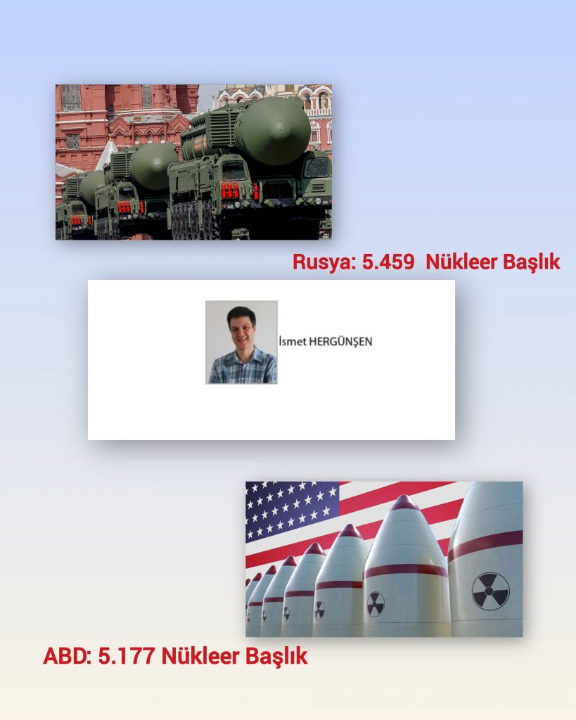 Stockholm Uluslararası Barış Araştırmaları Enstitüsü (SIPRI) verilerine göre, 2025 itibarıyla Rusya 5.459, ABD ise 5.177 nükleer savaş başlığıyla dünyada en fazla nükleer silaha sahip iki ülke.